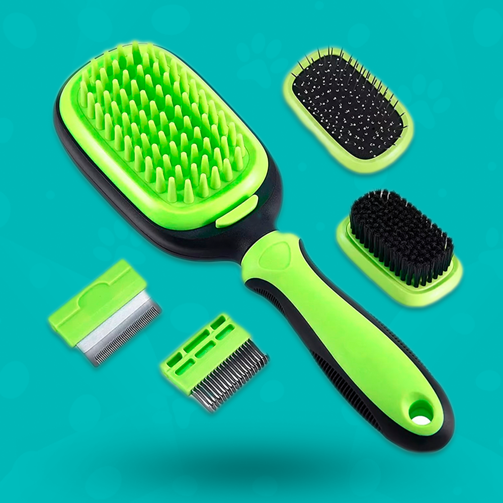 El cepillo de grooming para mascotas 5 en 1 incluye todo lo que necesitas: peine para desenredar, peine para eliminar pelo suelto, cepillo de cerdas, cepillo de pinchos y cepillo de baño y masaje. Ideal para un cuidado integral del pelaje de tu mascota