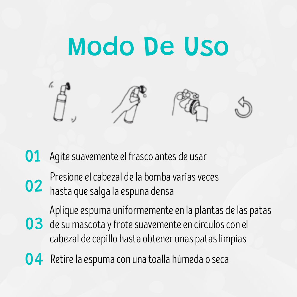 Espuma limpiadora para patas de perros. Agitar bien antes de usar, secar las patas después de la aplicación para una limpieza óptima