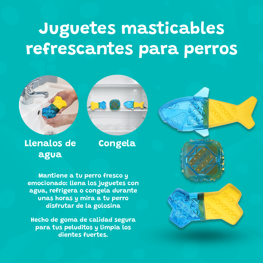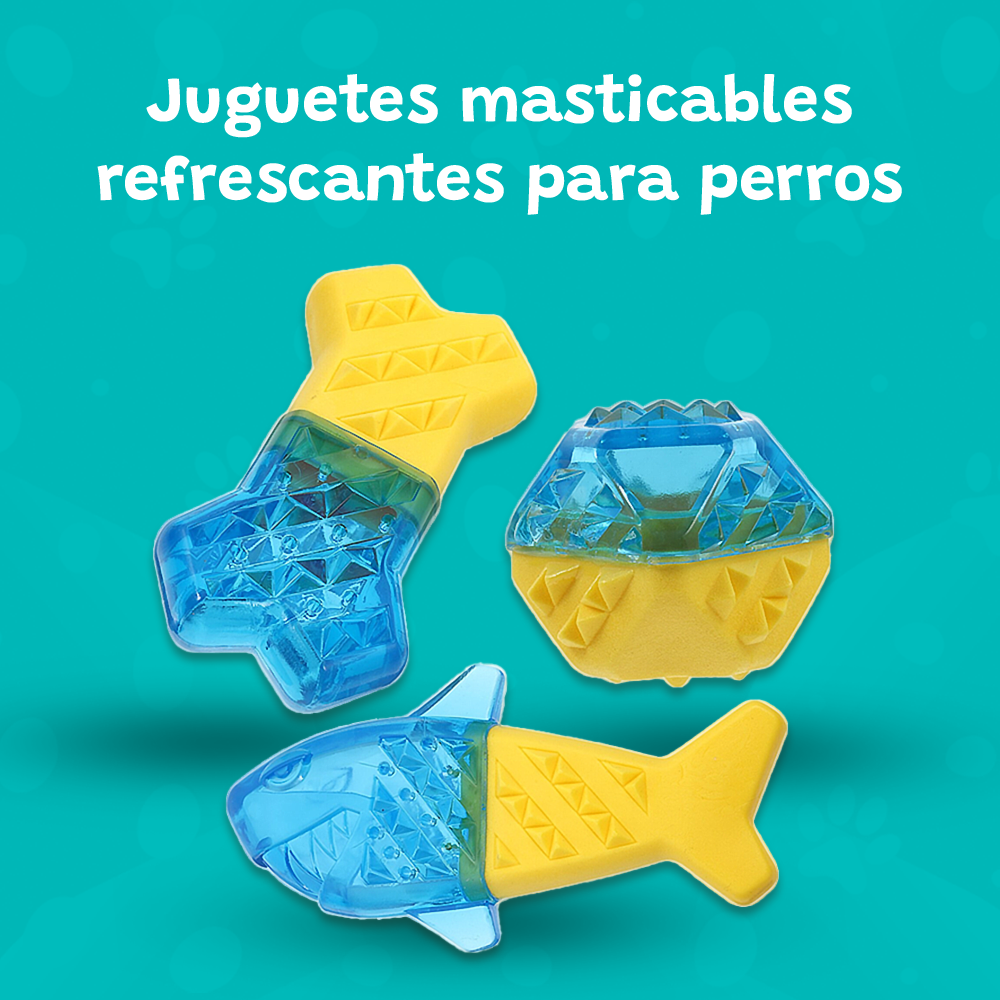 Juguetes de goma en forma de hueso, pez, y pelota, perfectos para limpiar las encías de tus mascotas y ofrecer tardes de diversión y bienestar.